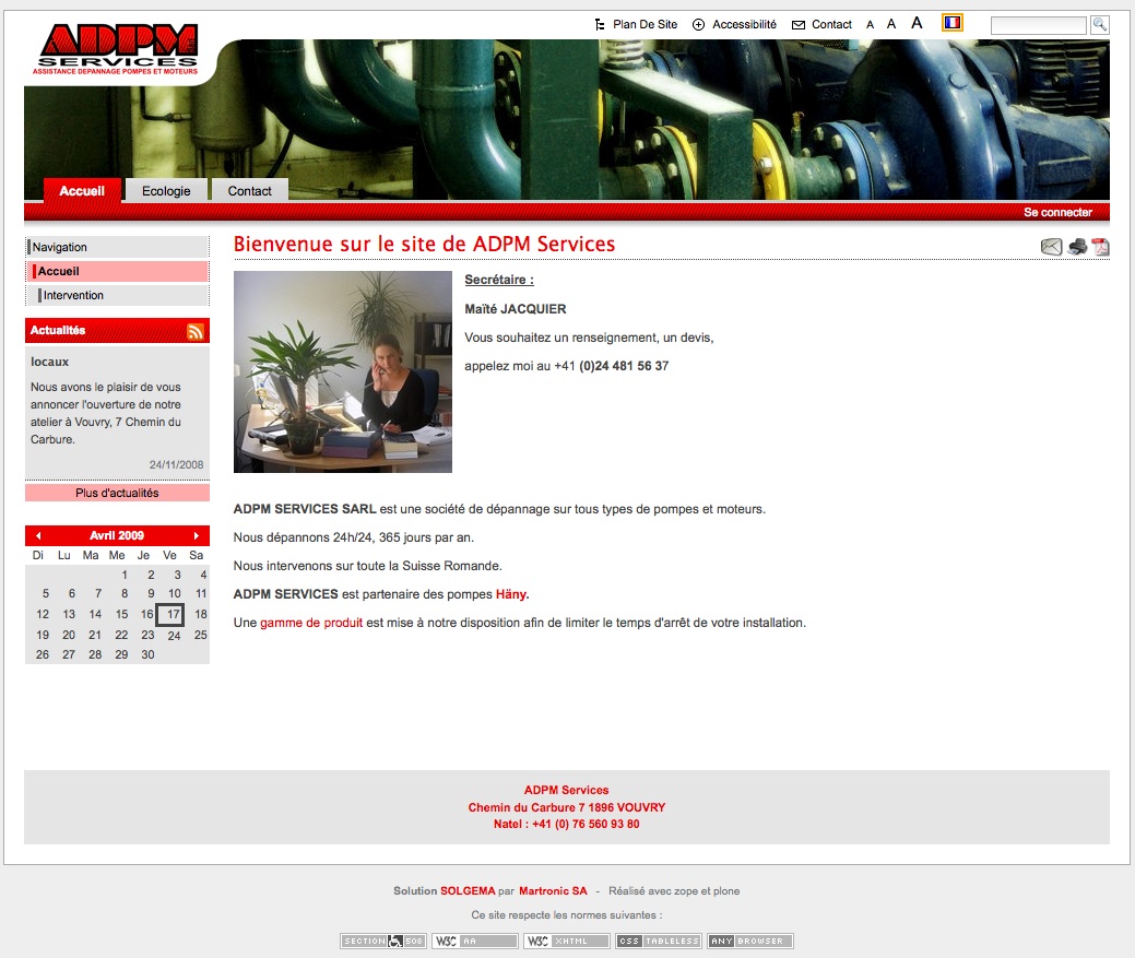 Photographie du site Internet de la société ADPM. Le site a été construit avec la solution Solgema.