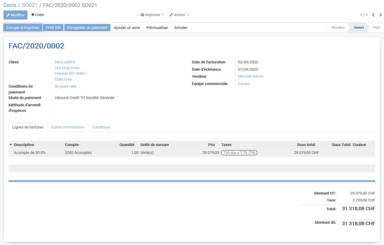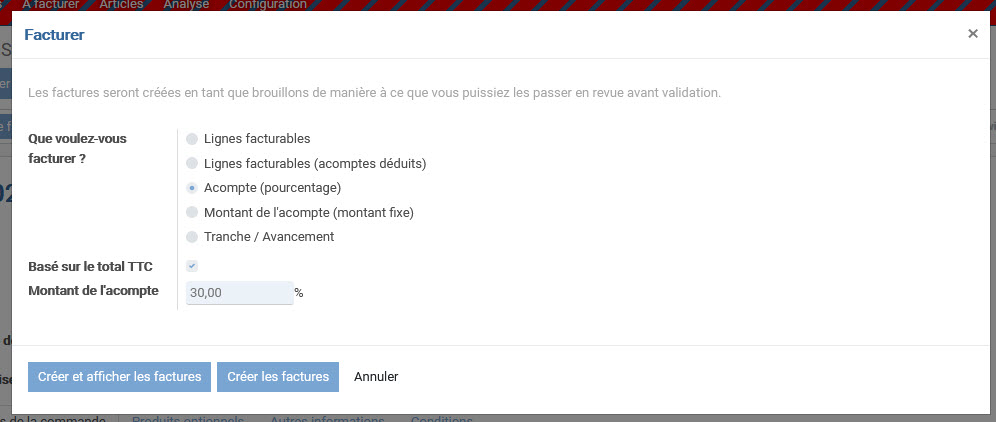 Facture 1er avancement avec déduction de l'acompte au prorata
