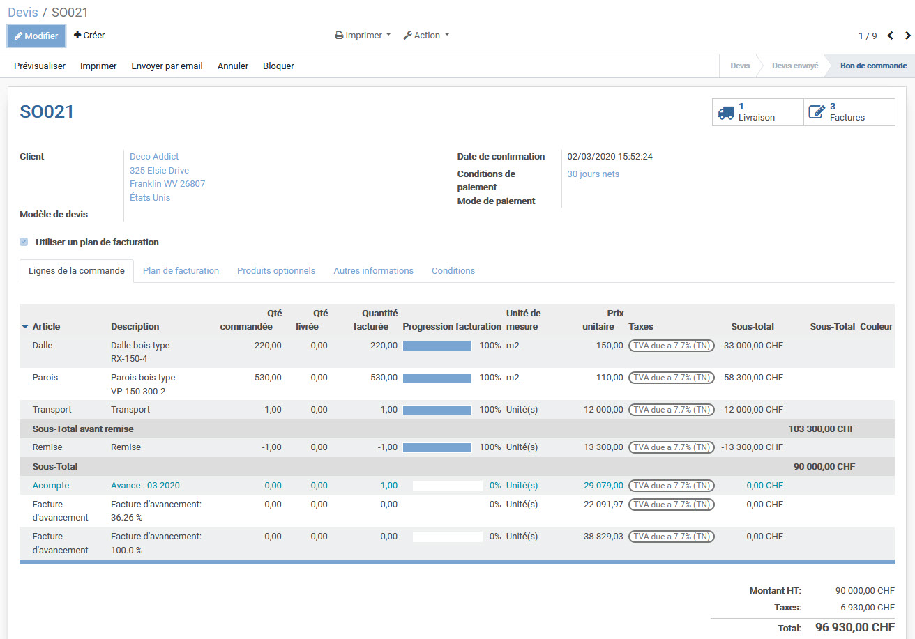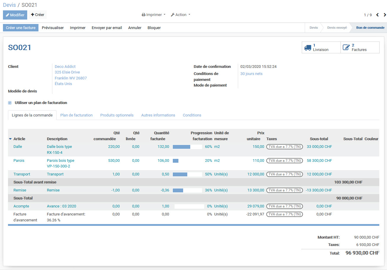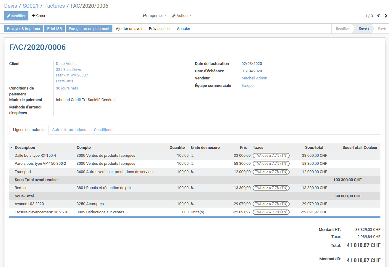 Facture finale avancement 100% avec déduction des acomptes et des factures d'avancement