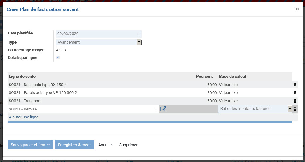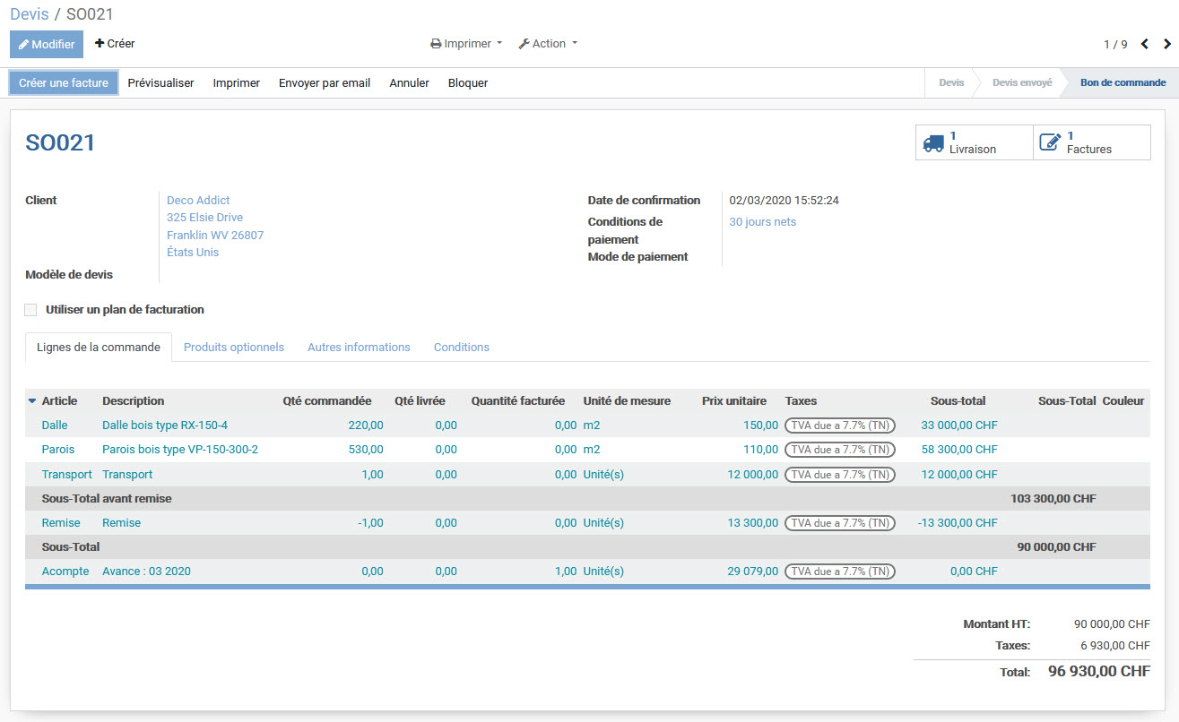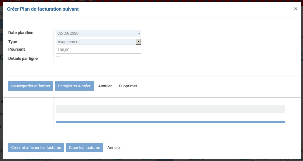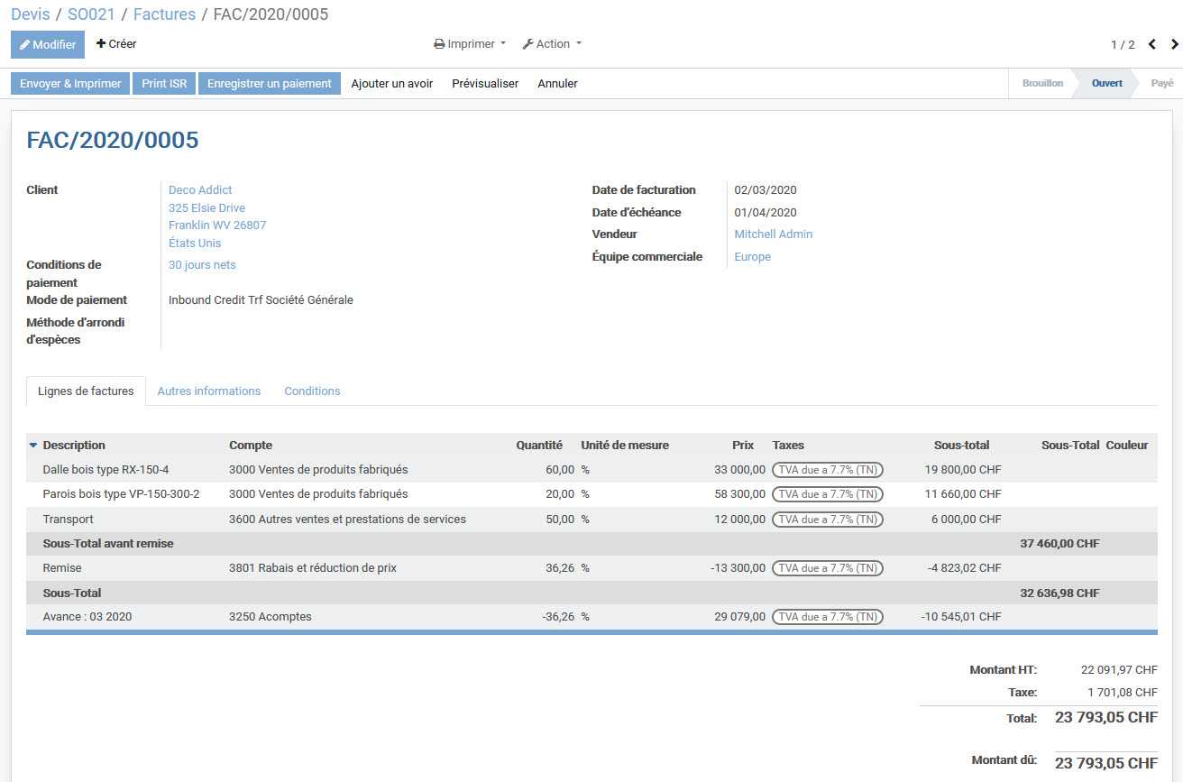 Facture finale avancement 100% avec déduction des acomptes et des factures d'avancement